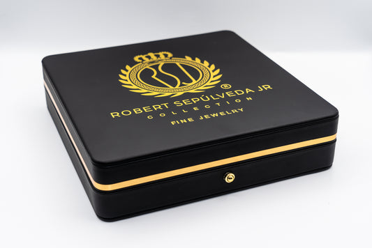 Introducing our sophisticated black and gold RSJ Collection jewelry boxes. Meticulously designed to exude timeless elegance each piece offers unparalleled protection from the elements while ensuring impeccable organization during your travels. A perfect fusion of practicality and opulence these boxes provide a distinguished home for your precious jewelry or treasured curiosities.